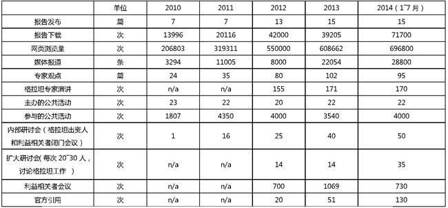 二是成熟的影响力评价体系。格拉坦研究所的影响力评价指标囊括了包括:发布报告数量、报告下载量、网页浏览量、媒体报道次数等十二个方面(详见上表)。研究所通过出版专著、期刊,召开新闻发布会,同政府定期召开座谈会等方式扩大自己的影响力。每年还要对300―400个利益相关者进行调查,调查结果纳入研究团队的绩效评估体系。从研究所的影响力评价体系可以看出,社会智库发挥影响力的主要渠道是研究成果发布、专家发言、线上线下的媒体报道、学术会议、公共活动和政府的引用几个方面。