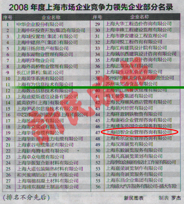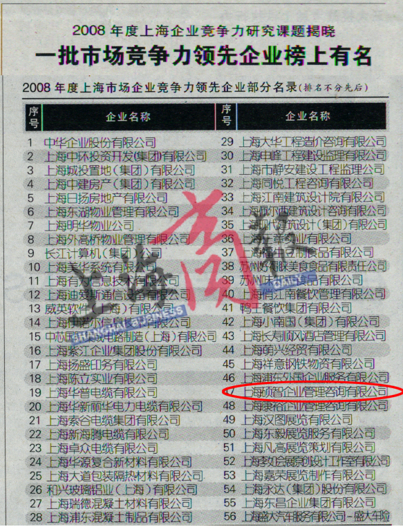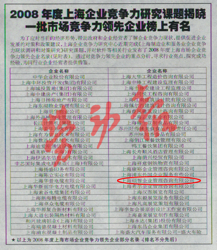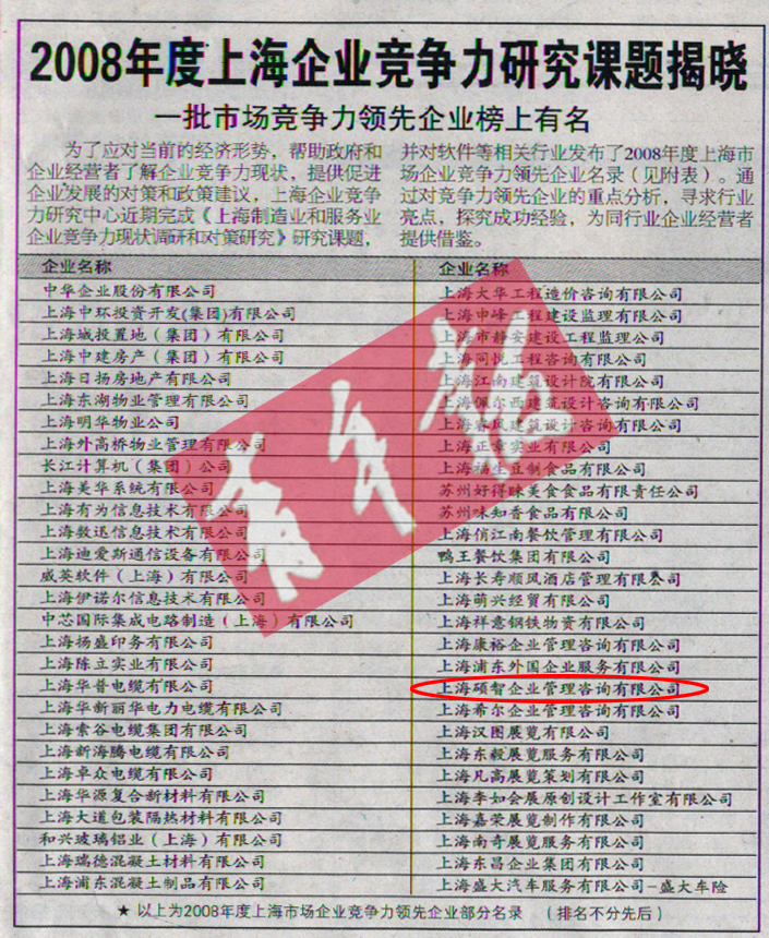 经过市统计局、市经济信息委、市商务委指导和资料佐证,行业协会(商会)协助调研,且根据规模、市场、服务(产品)、管理、技术、文化、团队、品牌、成长性、社会责任性等10项指对上海所有管理咨询企业进行分析、评估。我公司被评入‘2008年度上海管理咨询企业竞争力前50强’之行列。
